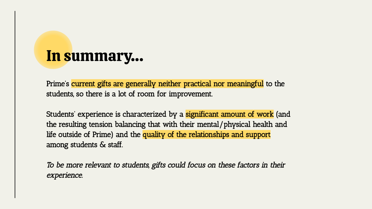 This finding indicated to me that the Access Accessories gift would intentionally make Prime more accessible, inclusive, and supportive, showing that Prime cares about its students’ well-being—not just their academic success. This impact would reflect Prime’s stated values of “including everyone” and “practicing empathy” in particular, proving that Prime brings these values into its actions, not just its language.