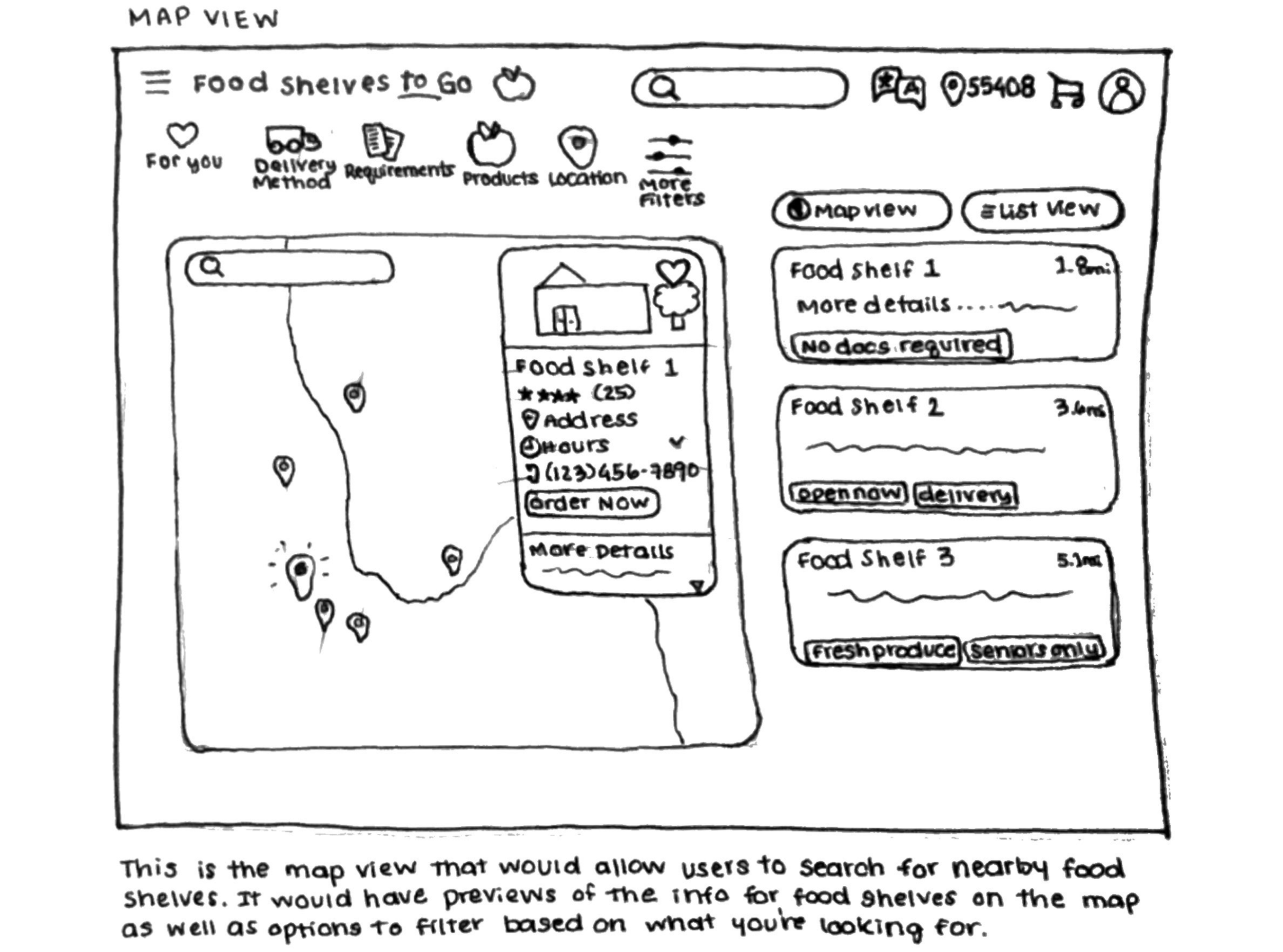In doing user research, I found that users’ main objectives were to find nearby food shelves, assess whether those food shelves would meet their needs, and get food quickly and conveniently. I then designed and tested a prototype of a website that aimed to meet these basic needs, giving local food shelf customers a more convenient, empowering pathway to accessing free food.