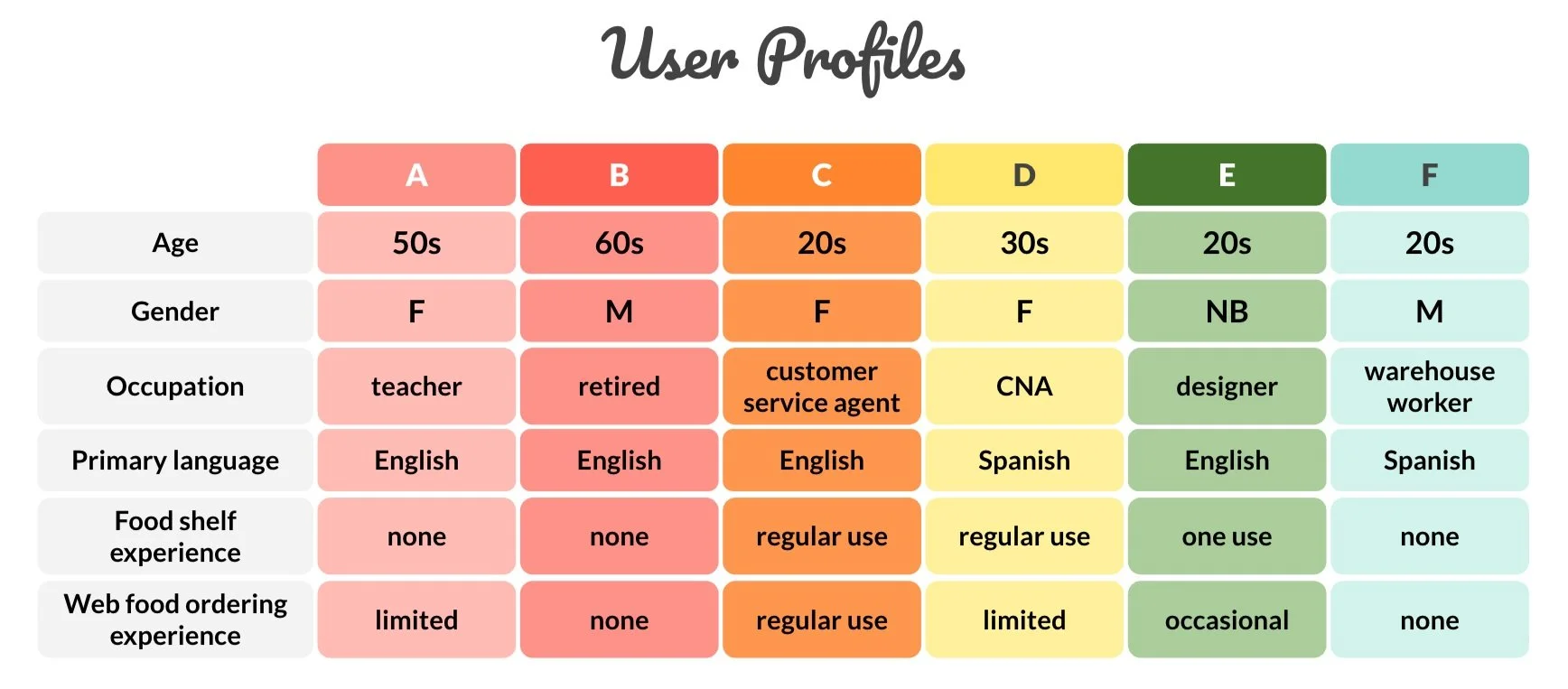 I recruited participants with varied backgrounds for user testing. I was looking in particular for a range of experience with accessing food shelves and using food ordering websites. I also intentionally included two individuals whose primary language was not English to assess how accessible the site would be for non-native English speakers.