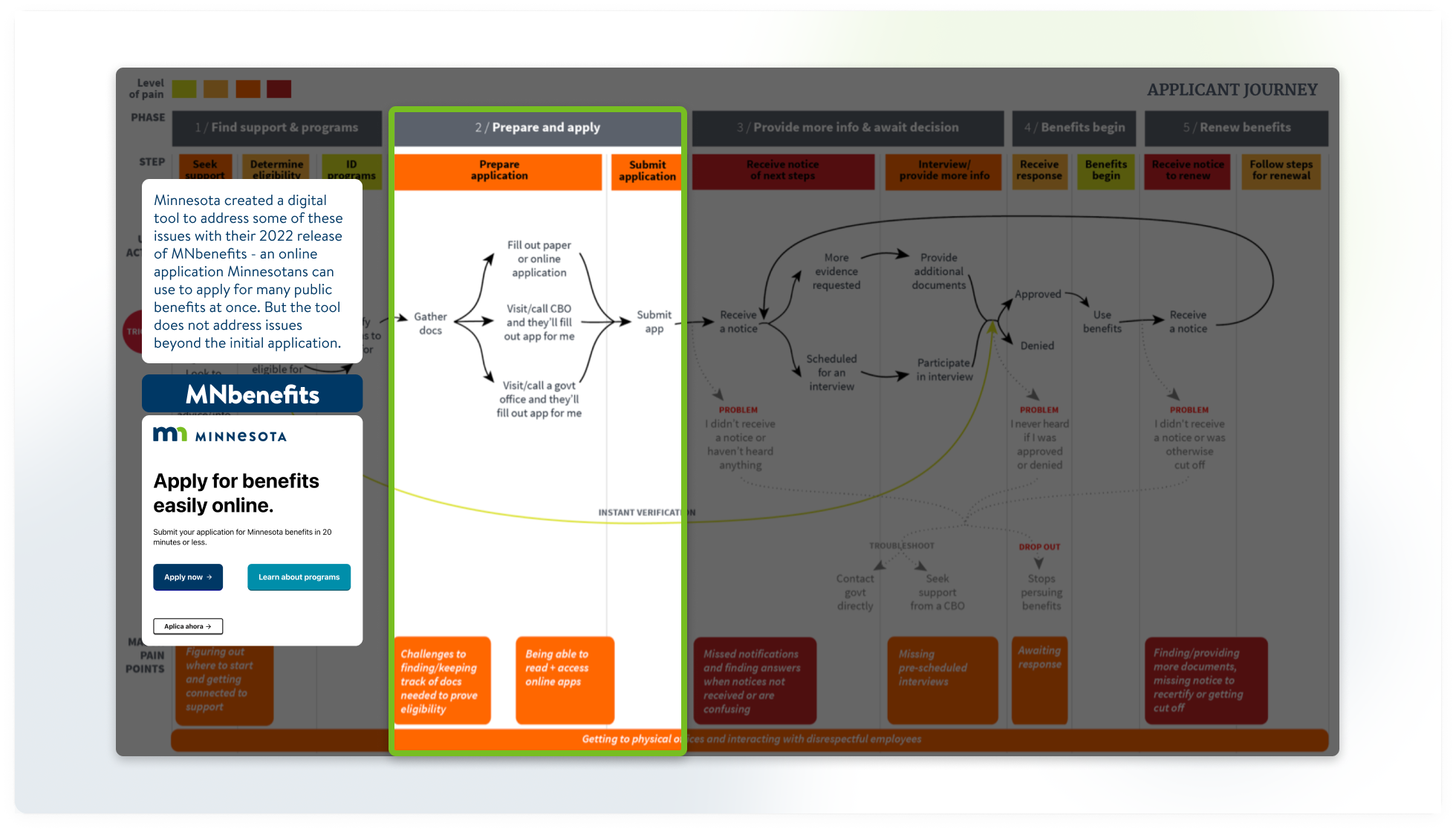 The U.S. Digital Service and Centers for Medicare and Medicaid Services’ 2016 report Mapping the Applicant Experience of Benefit Enrollment reveals that this pathway to benefits and many of the barriers along the way are common in benefits systems across the country. And it was this research that helped inform the creation of MNbenefits in 2022, which provided a one-stop online application for applying for Minnesota public benefits.