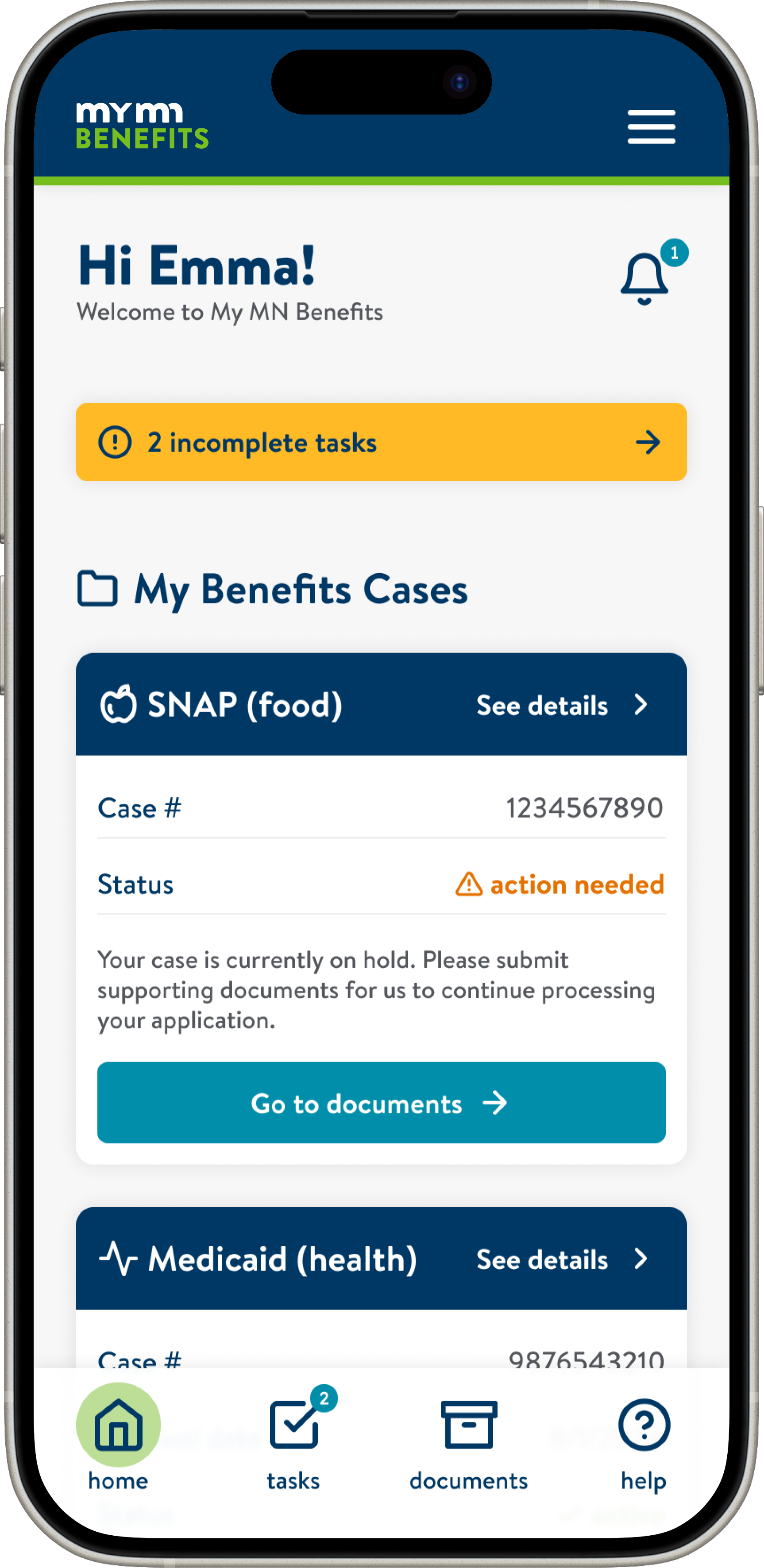Based on my research and multiple rounds of usability testing, I created an initial design and interactive prototype for My MN Benefits—a public benefits enrollment and management app.