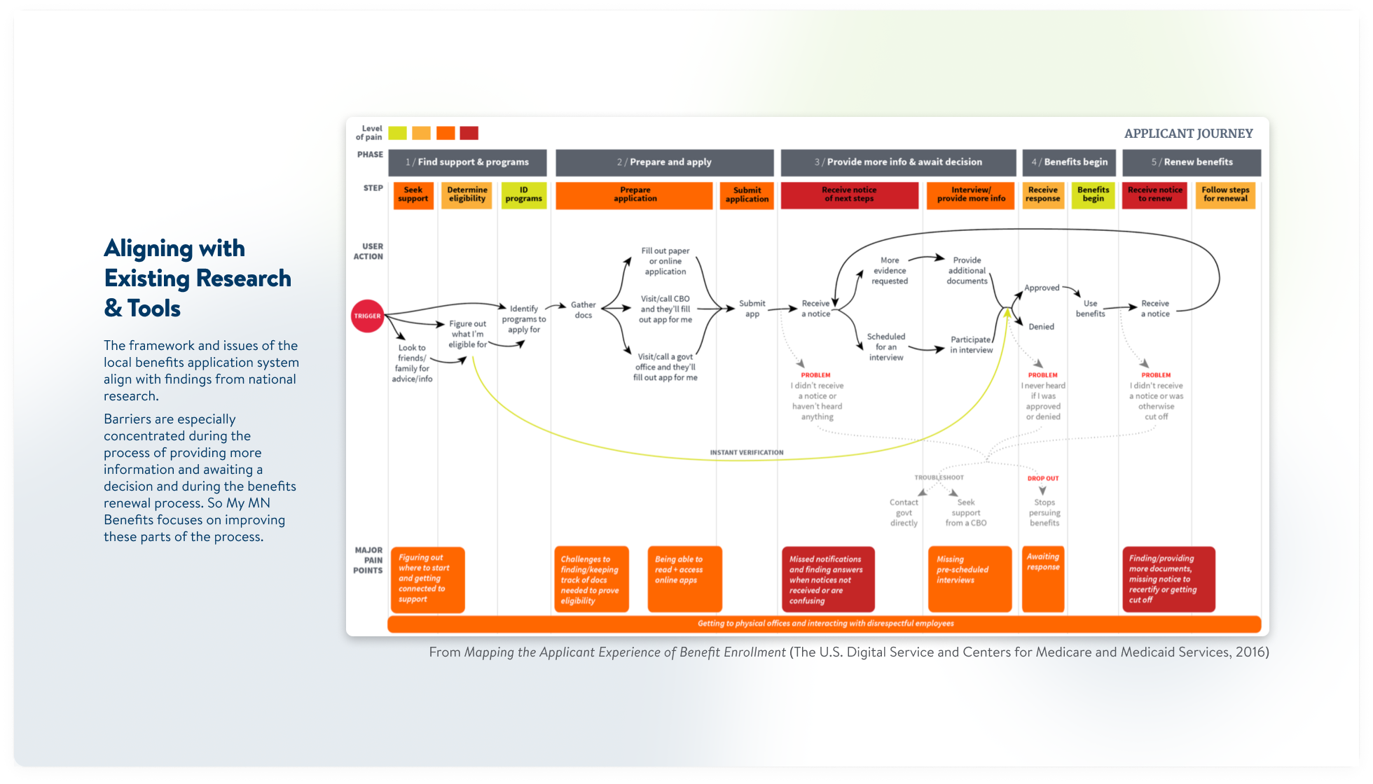 The U.S. Digital Service and Centers for Medicare and Medicaid Services’ 2016 report Mapping the Applicant Experience of Benefit Enrollment aligns with the stages and barriers I found when I mapped Minnesota's benefits enrollment process.