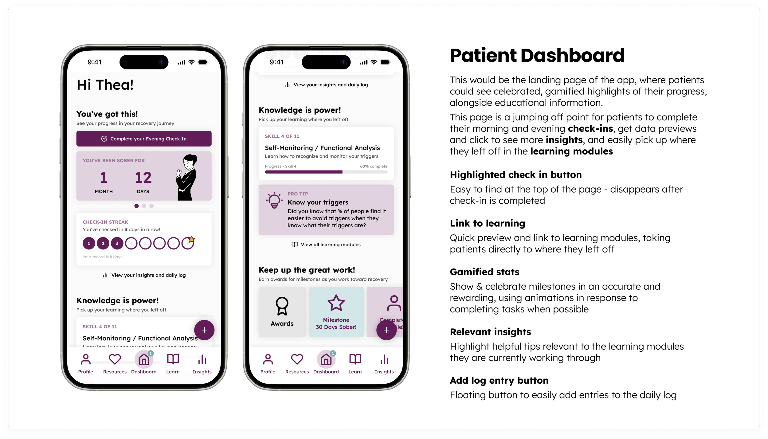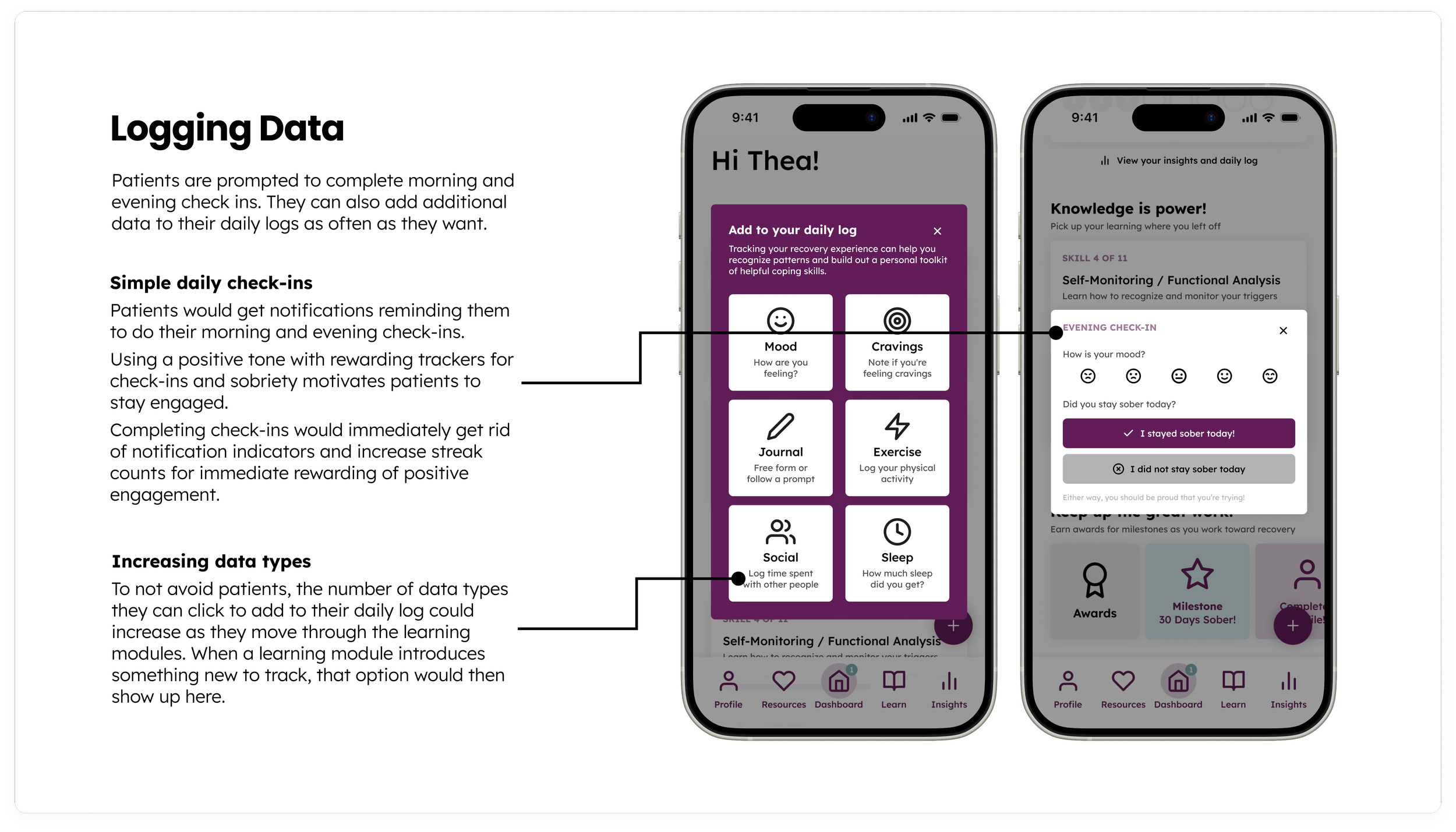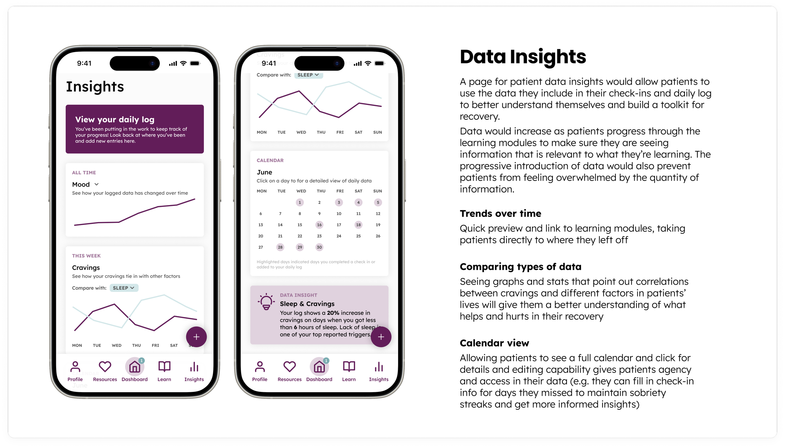 Dashboard & Insights - a landing page and more in-depth data page on the app where patients would be able to complete daily check-ins, see their recovery milestones, see visual representations of their data, and easily pick up their learning from wherever they left off (See my annotated wireframes for these touchpoints [also included below] or check out my interactive prototype for these features)