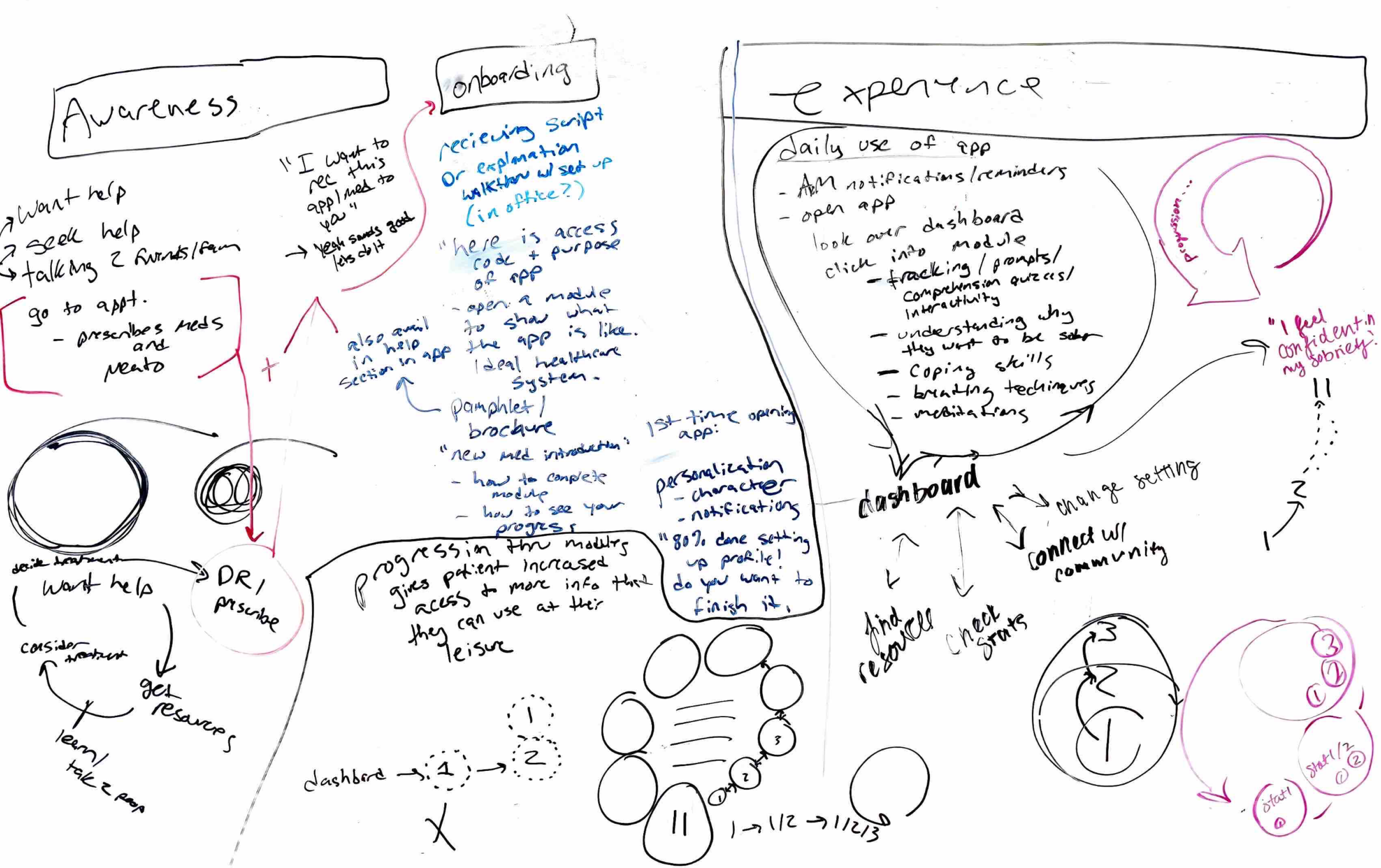 Based on our research into the landscape of existing apps to support patients with substance use disorders, my team and I crafted an overarching strategy and 3 key patient touchpoints, which we prototyped to propose a structure for patient interactions with the app.